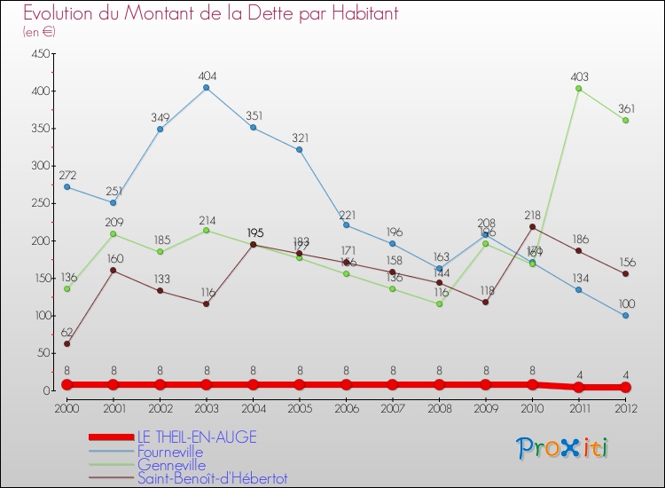 Par rapport aux 178 habitants de Le Theil-en-Auge, en 2012 le poids de cette dette représente 4 € par habitant.