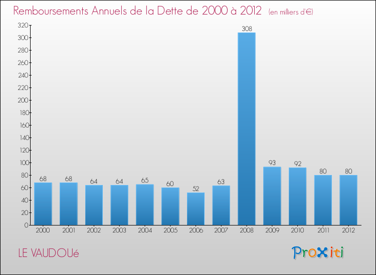 Par rapport aux 764 habitants de Le Vaudoué, en 2012 le poids de cette dette représente 876 € par habitant.