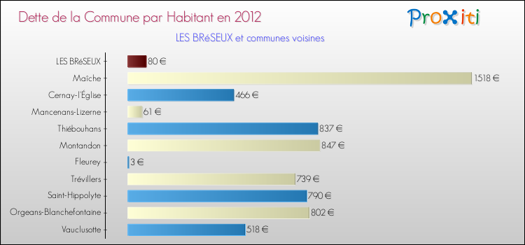 A Les Bréseux, la dette due par habitant de la commune en 2012 est donc moins élevée de 85.29 % que pour des communes similaires.