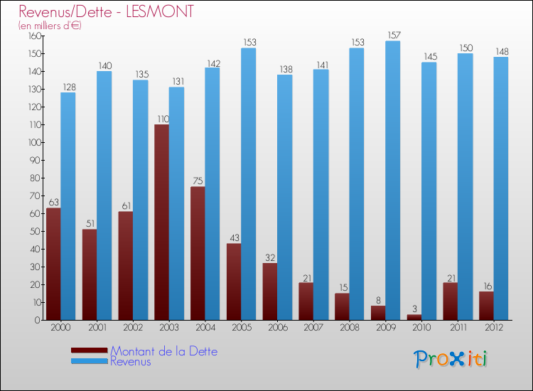 Comparaison de la dette et des revenus pour LESMONT de 2000 à 2012
