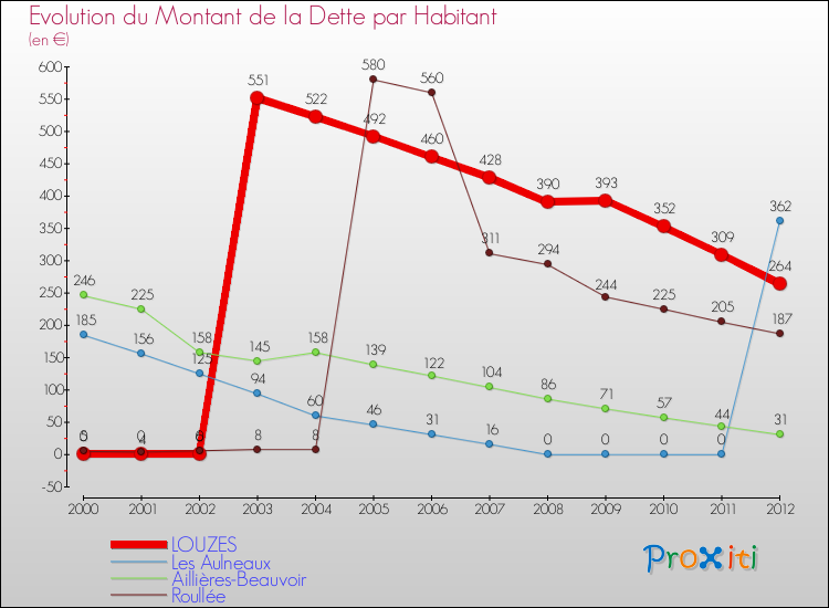 Le graphique ci-dessous représente l'évolution de la dette par habitant à Louzes depuis 2000.