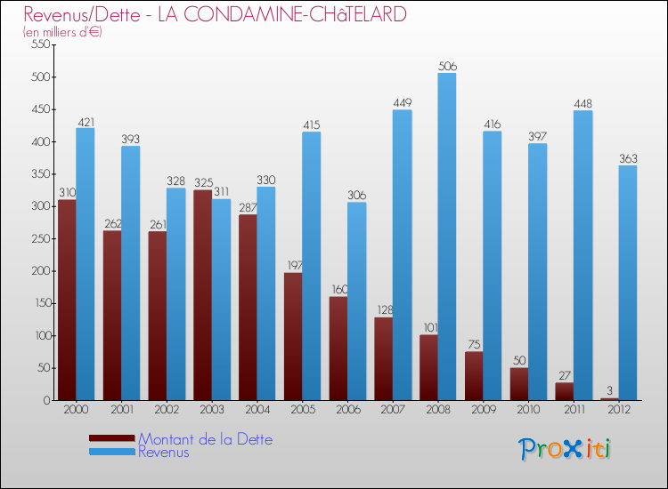 Comparaison Revenus/Dette de La Condamine-Châtelard (de 2000 à 2012)