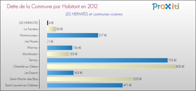 A noter : la valeur moyenne de la dette par habitant des communes françaises similaires à Les Hermites était de 596 € par habitant, en 2012.