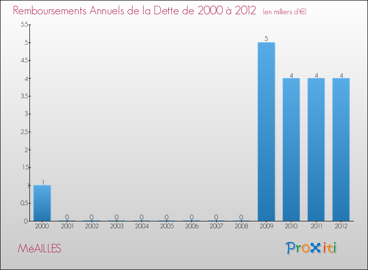 A Méailles, la dette par habitant a baissé de 44.81 % entre 2008 et 2012.