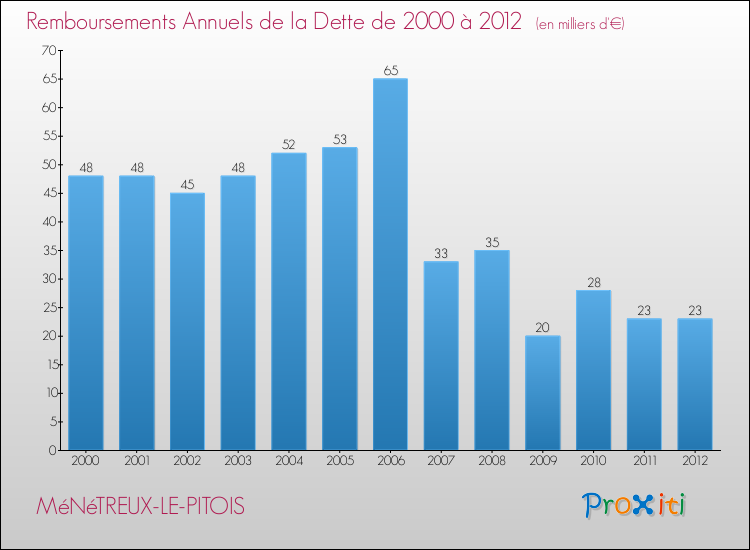 Pendant la même période, les communes françaises similaires à Ménétreux-le-Pitois, ont vu leur dette par habitant augmenter de 23.92 % en moyenne entre 2000 et 2012.
