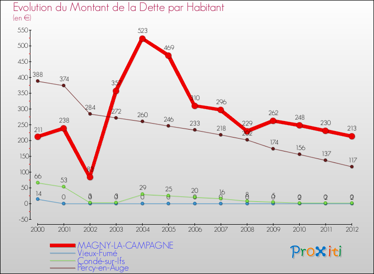 Par rapport aux 581 habitants de Magny-la-Campagne, en 2012 le poids de cette dette représente 213 € par habitant.