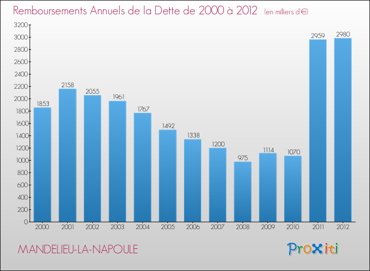 A Mandelieu-la-Napoule, la dette par habitant a donc baissé de 70.93 % entre 2000 et 2012.