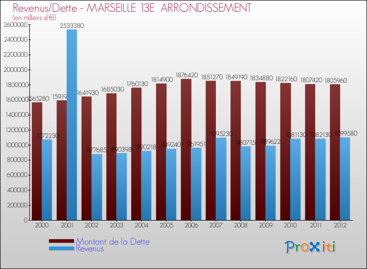 Comparaison Revenus/Dette de Marseille 13e Arrondissement (de 2000 à 2012)