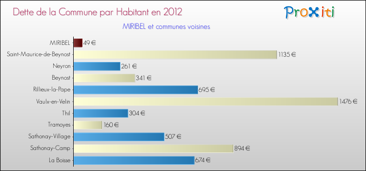 Comparaison de la dette par habitant de la commune en 2012 pour MIRIBEL et les communes voisines