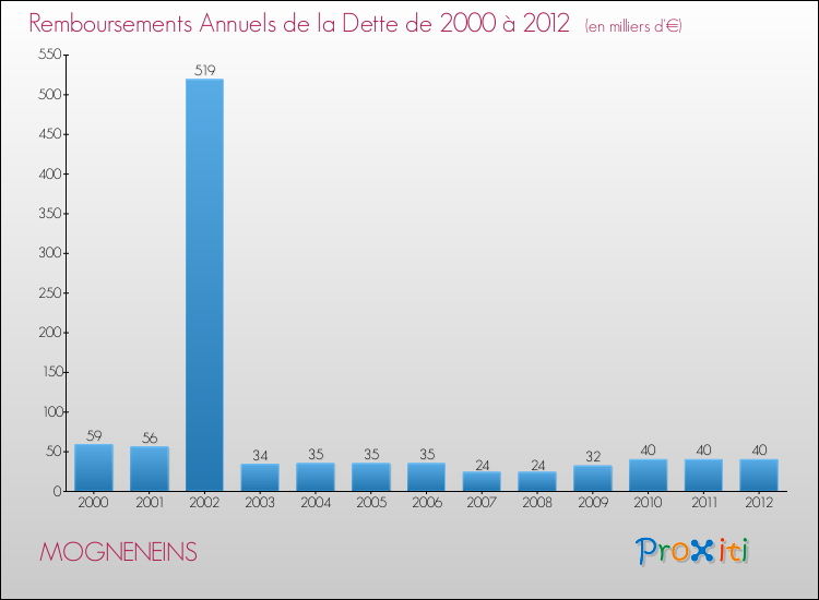 A Mogneneins, la dette due par habitant de la commune en 2012 est donc moins élevée de 55.37 % que pour des communes similaires.