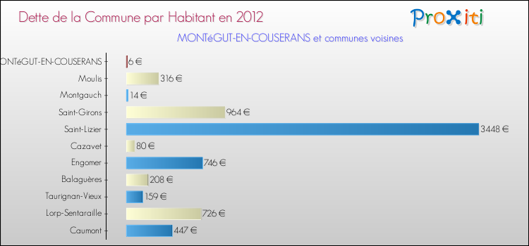 A Montégut-en-Couserans, la dette due par habitant de la commune en 2012 est donc moins élevée de 98.81 % que pour des communes similaires.