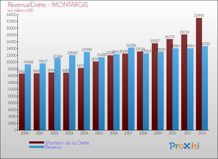 Comparaison Revenus/Dette de Montargis (de 2000 à 2012)