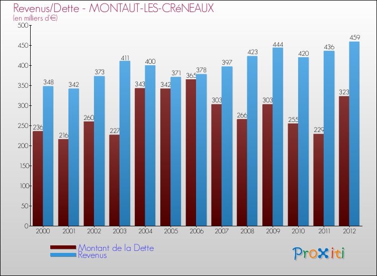 Comparaison Revenus/Dette de Montaut-les-Créneaux (de 2000 à 2012)