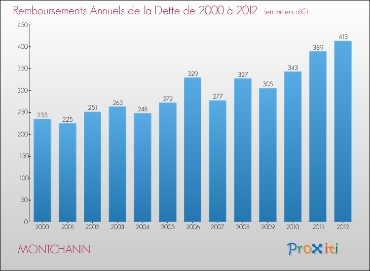A Montchanin, la dette par habitant a donc augmenté de 99.16 % entre 2000 et 2012.