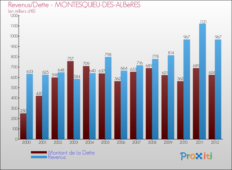 Comparaison Revenus/Dette de Montesquieu-des-Albères (de 2000 à 2012)