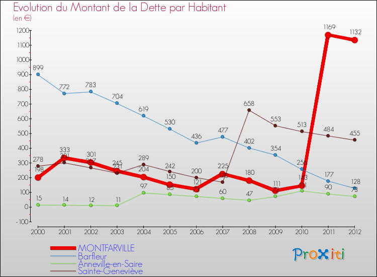 A Montfarville, la dette par habitant a donc augmenté de 471.72 % entre 2000 et 2012.