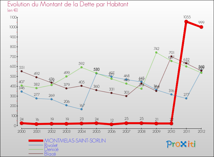 Par rapport aux 368 habitants de Montmelas-Saint-Sorlin, en 2012 le poids de cette dette représente 999 € par habitant.