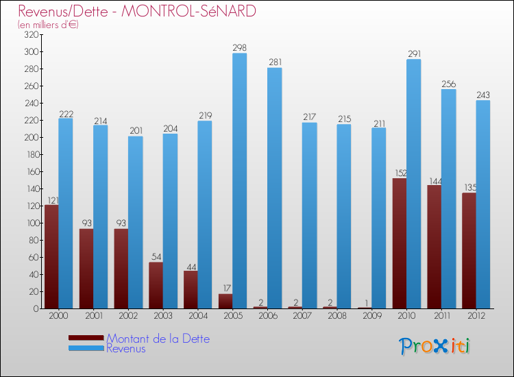 Comparaison Revenus/Dette de Montrol-Sénard (de 2000 à 2012)