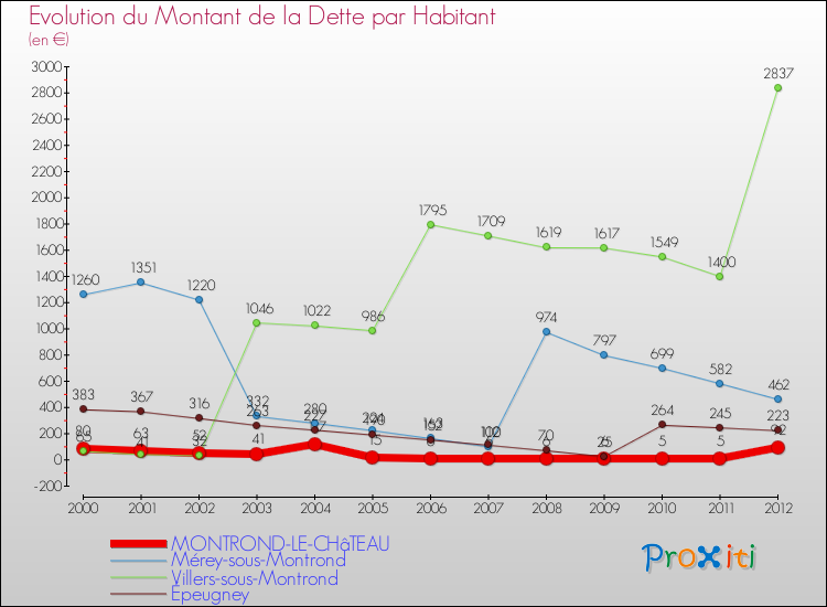 Pendant la même période, les communes françaises similaires à Montrond-le-Château, ont vu leur dette par habitant augmenter de 50.11 % en moyenne entre 2000 et 2012.