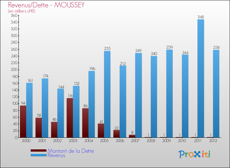 Comparaison Revenus/Dette de Moussey (de 2000 à 2012)