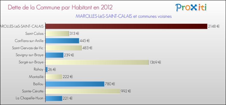 A Marolles-lès-Saint-Calais, la dette due par habitant de la commune en 2012 est donc plus élevée de 331.33 % que pour des communes similaires.