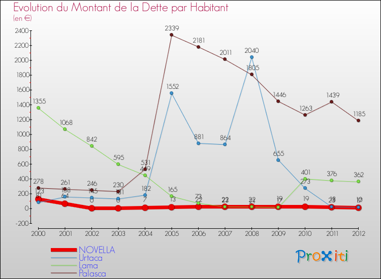 Par rapport aux 91 habitants de Novella, en 2012 le poids de cette dette représente 10 € par habitant.