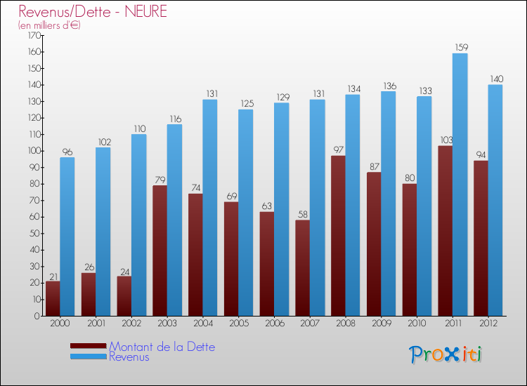 Par rapport aux 174 habitants de Neure, en 2012 le poids de cette dette représente 541 € par habitant.