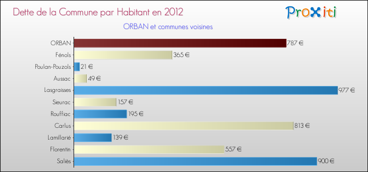 A Orban, la dette due par habitant de la commune en 2012 est donc plus élevée de 58.03 % que pour des communes similaires.