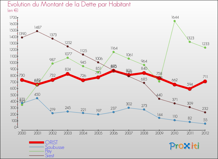 Par rapport aux 673 habitants de Orist, en 2012 le poids de cette dette représente 711 € par habitant.