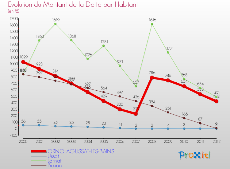 A Ornolac-Ussat-les-Bains, la dette par habitant a donc baissé de 58.89 % entre 2000 et 2012.