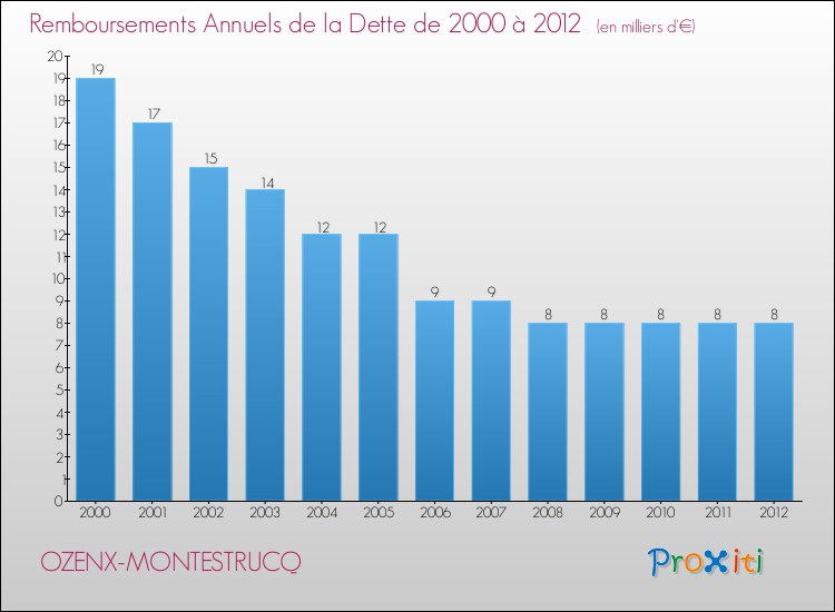 A Ozenx-Montestrucq, la dette par habitant a donc baissé de 90.46 % entre 2000 et 2012.
