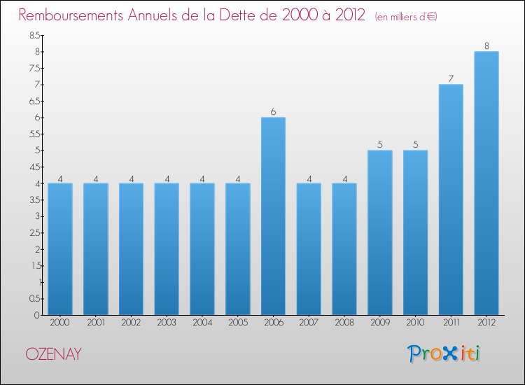 A Ozenay, la dette par habitant a donc augmenté de 318.52 % entre 2000 et 2012.