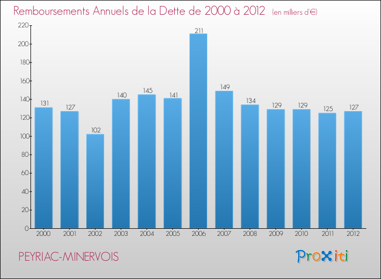 Par rapport aux 1104 habitants de Peyriac-Minervois, en 2012 le poids de cette dette représente 1104 € par habitant.