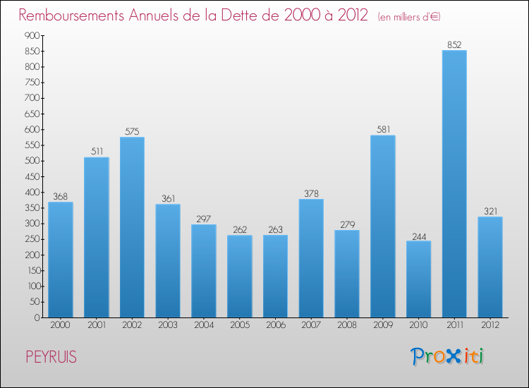 A Peyruis, ce montant de la dette est pourtant en baisse de 7.43 % par rapport à 2011.