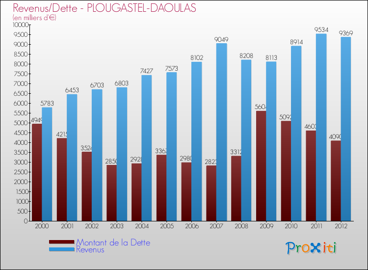 Comparaison Revenus/Dette de Plougastel-Daoulas (de 2000 à 2012)