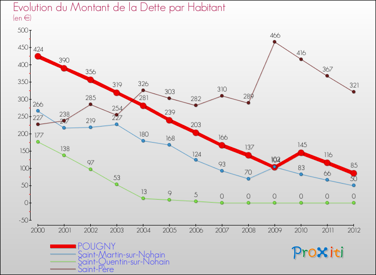 Par rapport aux 485 habitants de Pougny, en 2012 le poids de cette dette représente 85 € par habitant.