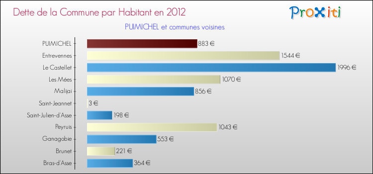 Par rapport aux 253 habitants de Puimichel, en 2012 le poids de cette dette représente 883 € par habitant.