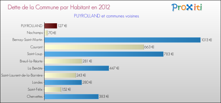 Par rapport aux 206 habitants de Puyrolland, en 2012 le poids de cette dette représente 127 € par habitant.