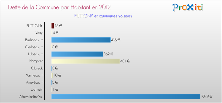 Par rapport aux 73 habitants de Puttigny, en 2012 le poids de cette dette représente 15 € par habitant.
