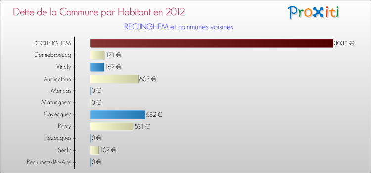 A Reclinghem, la dette due par habitant de la commune en 2012 est donc plus élevée de 500.59 % que pour des communes similaires.