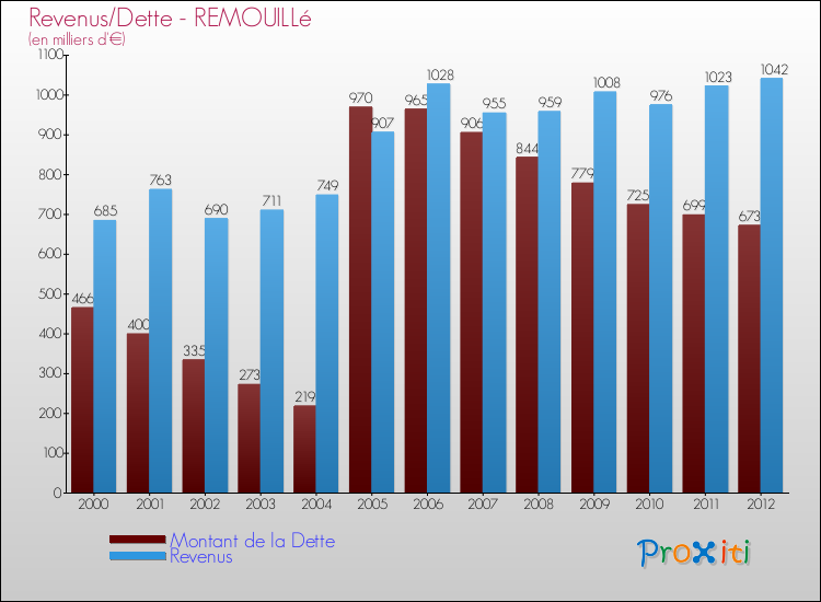 Par rapport aux 1699 habitants de Remouillé, en 2012 le poids de cette dette représente 396 € par habitant.