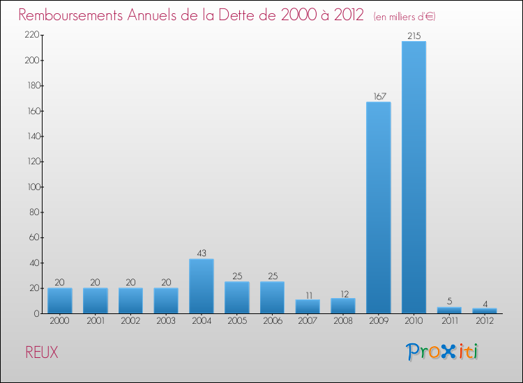 Par rapport aux 349 habitants de Reux, en 2012 le poids de cette dette représente 13 € par habitant.