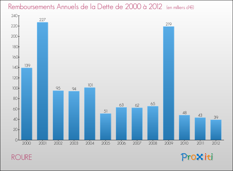 Par rapport aux 219 habitants de Roure, en 2012 le poids de cette dette représente 718 € par habitant.
