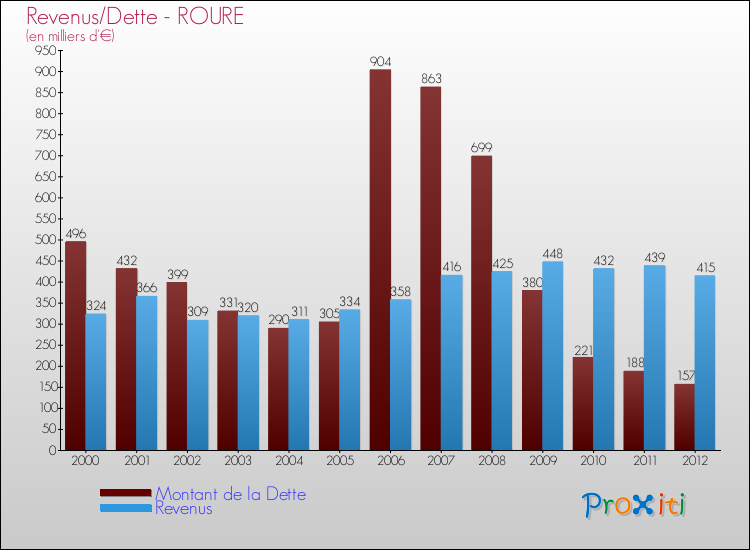 Comparaison Revenus/Dette de Roure (de 2000 à 2012)