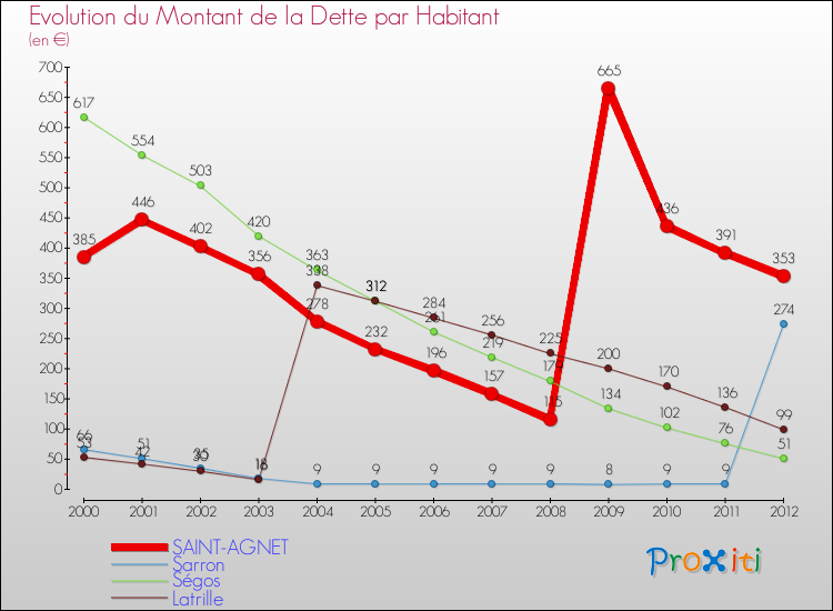Pendant la même période, les communes françaises similaires à Saint-Agnet, ont vu leur dette par habitant augmenter de 45.45 % en moyenne entre 2000 et 2012.