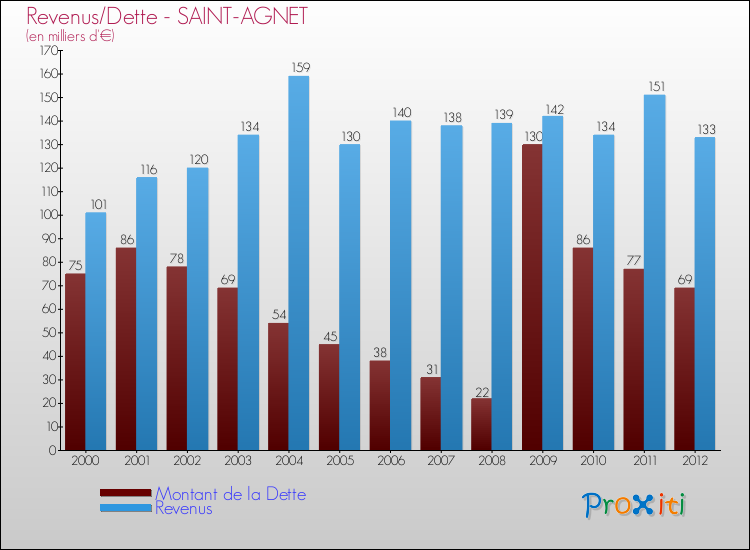 Comparaison Revenus/Dette de Saint-Agnet (de 2000 à 2012)