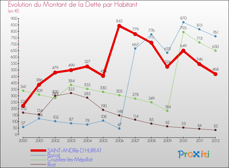 A Saint-André-d'Huiriat, la dette par habitant a donc augmenté de 111.76 % entre 2000 et 2012.