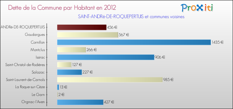 A noter : la valeur moyenne de la dette par habitant des communes françaises similaires à Saint-André-de-Roquepertuis était de 596 € par habitant, en 2012.