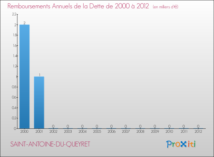 A Saint-Antoine-du-Queyret, la dette par habitant a donc baissé de 100 % entre 2000 et 2012.