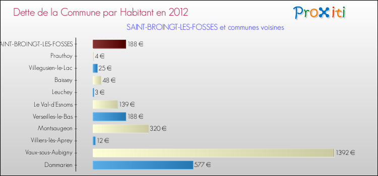 A Saint-Broingt-les-Fosses, la dette due par habitant de la commune en 2012 est donc moins élevée de 62.77 % que pour des communes similaires.